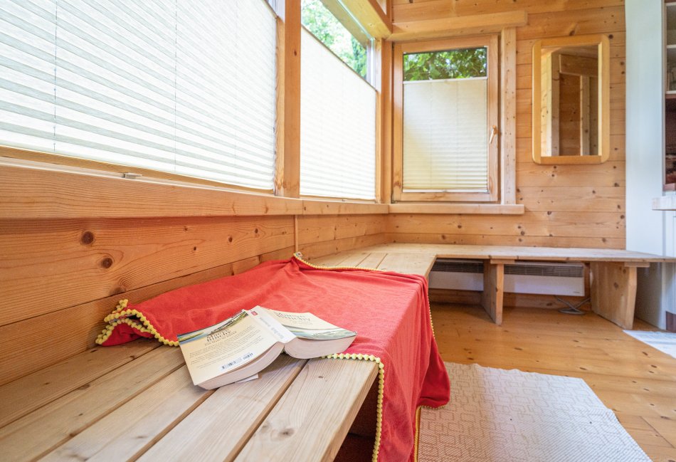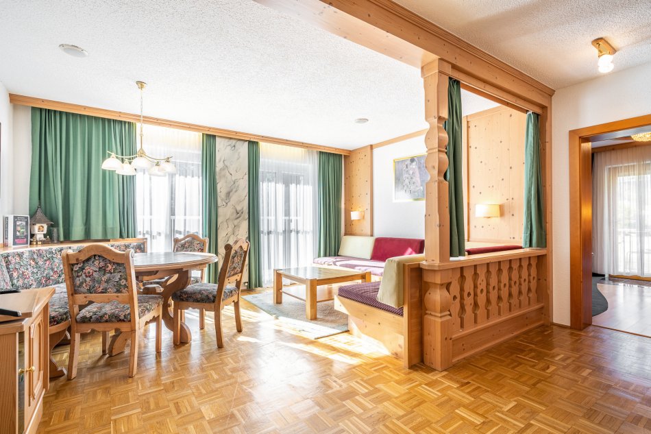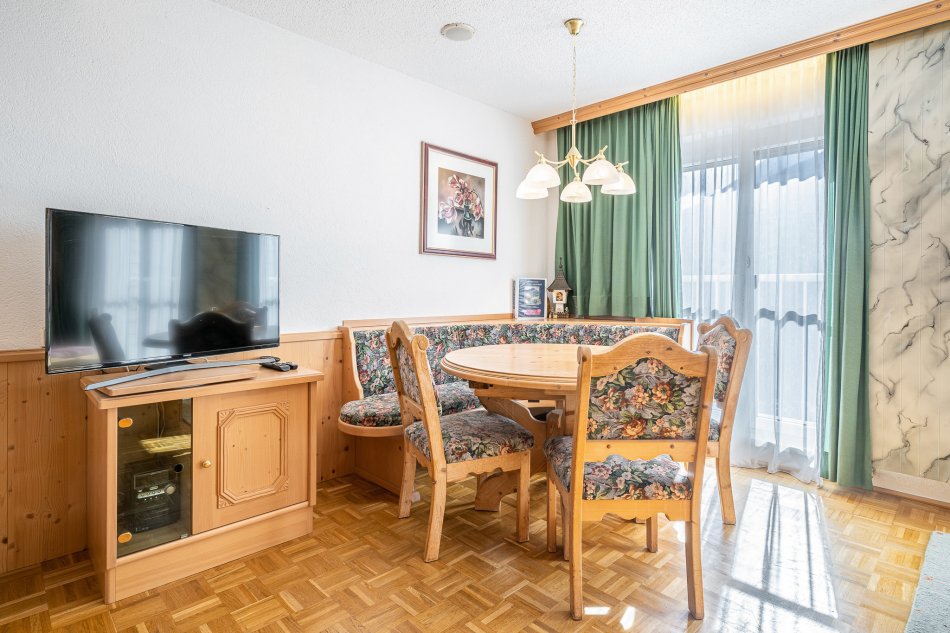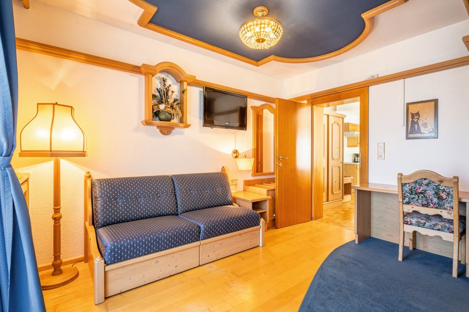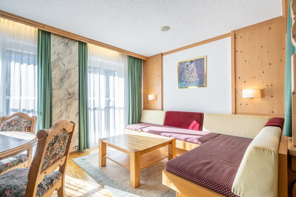 Große Wohn-Küche mit 2 Schlafzimmern südseitig im Dietrich Betriebsgebäude (Obergeschoss). Gehobene Ausstattung mit rustikalen Naturholzmöbeln, Kabel TV, Küchenblock mit Mikrowelle, Geschirrspüler, Kühlschrank, komplette Geschirr- und Besteckausstattung, Kaffeemaschine, Zentralheizung, Badezimmer mit Dusche/Haarfön, Doppelwaschtisch und separates WC. Direkter Zugang zum Garten mit Freischwimmbad.