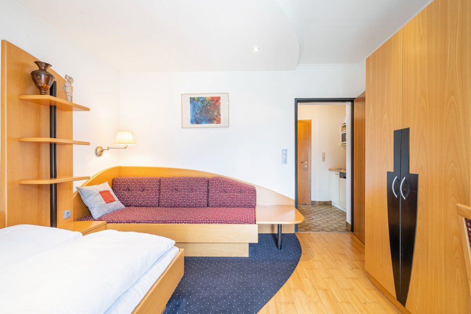 Das Appartement Bergblick hat einen direkten Zugang zur Liegewiese mit Freischwimmbad und Gartensauna. Das Appartement ist mit einem französischen Bett und einer Couch, welche als Zusatzbett verwendet werden kann, ausgestattet. Weiters gehören ein Schreibtisch, Sat-TV und ein Safe zur Einrichtung. Das Appartement verfügt über einen Küchenblock mit Kühlschrank, Geschirrspüler und Mikrowelle, inklusive Geschirr- und Besteckausstattung, ein Badezimmer mit Bad und Dusche, separates WC.